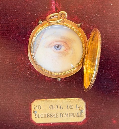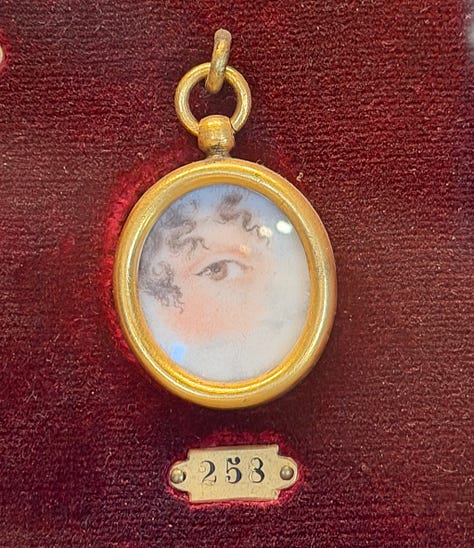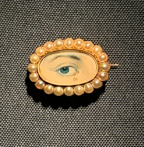 I’ve been noticing Lover’s Eye miniatures lately — tiny portraits of a single eye, exchanged as jewelry and tokens of affection in the eighteenth century. They’re surprisingly intimate and sometimes scandalous for such cute, tiny keepsakes. Once you notice one, it’s hard not to imagine the story it carries.