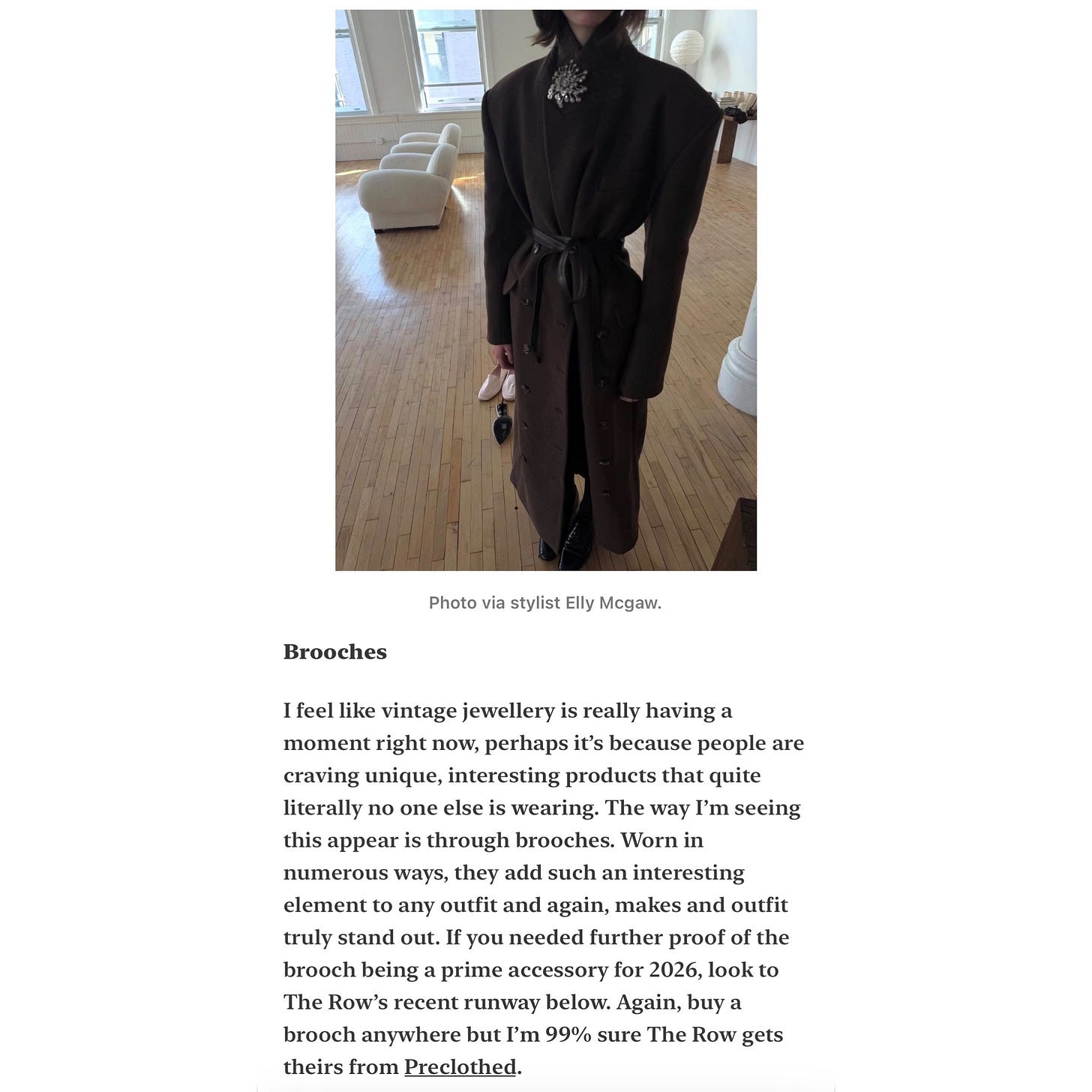 Last week in What I Bought I mentioned my brooch hunt through the Paris flea market. This week, between Paris Fashion Week’s end, the Oscars, my neighbor, and a few Substacks, I noticed others on the bandwagon. Maybe the brooch is back?